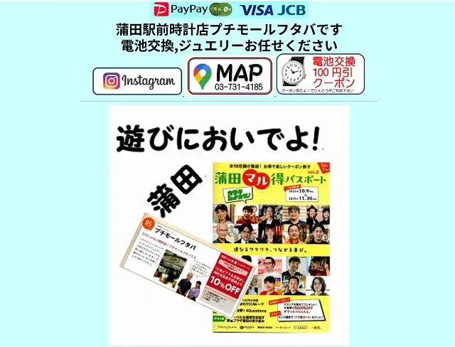 プチモールフタバはJR蒲田駅徒歩1分で、アクセスが抜群のお店です。カジュアルで個性的な時計が並んでいるお店です。